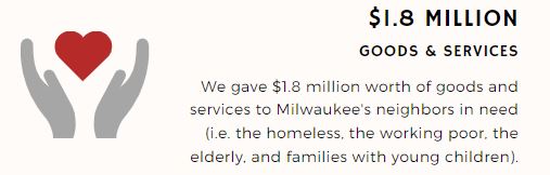 We are dedicated to eliminating poverty and hunger throughout Milwaukee County. In 2023, our nonprofit gave $1.8 million in goods and services to the most vulnerable members of the Milwaukee community.