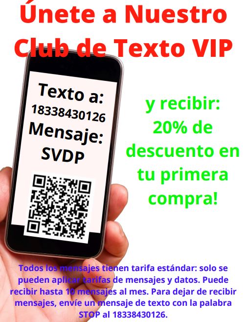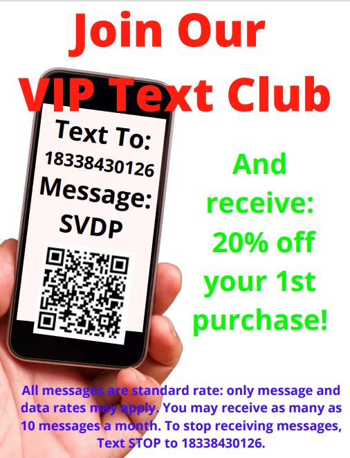 Using your cellphone, text SVDP (or scan the QR code shown in the images below) to 18338430126. By doing so, you'll exclusive offers from our Thrift Stores to your cell phone each week!